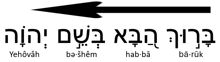 Yeshua said that we would not see Him again until we say (Matthew 23:39 NIV), “Blessed is he who comes in the name of the LORD.” But He did not say, “the LORD.” He spoke His Father’s name, “Yehovah.” Things are going to get bad soon. Tribulation is coming; we might even say that it has already begun. Maybe we should learn this phrase, in Hebrew, so we can be prepared to say it so He can return before no flesh survives what is in our near future (read right to left):
